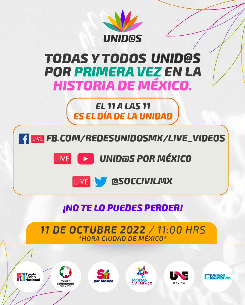 De acuerdo con una publicación en Twitter, la presentación de «Unid@s» tendrá lugar el próximo martes 11 de octubre a las 11:00 horas, misma que la ciudadanía podrá sintonizar a través de redes sociales.